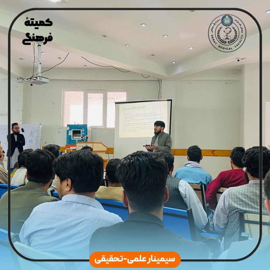 In collaboration with the Herat University Medical Students’ Association (HUMSA), Herat Faculty of Medicine at Herat University hosted an academic-research seminar entitled “KAP Surveys” Held in the faculty’s main conference hall on Monday, 6 October 2025, the seminar was presented by Dr. Mohammad Masudi and brought together faculty members and students for an engaging scholarly exchange.